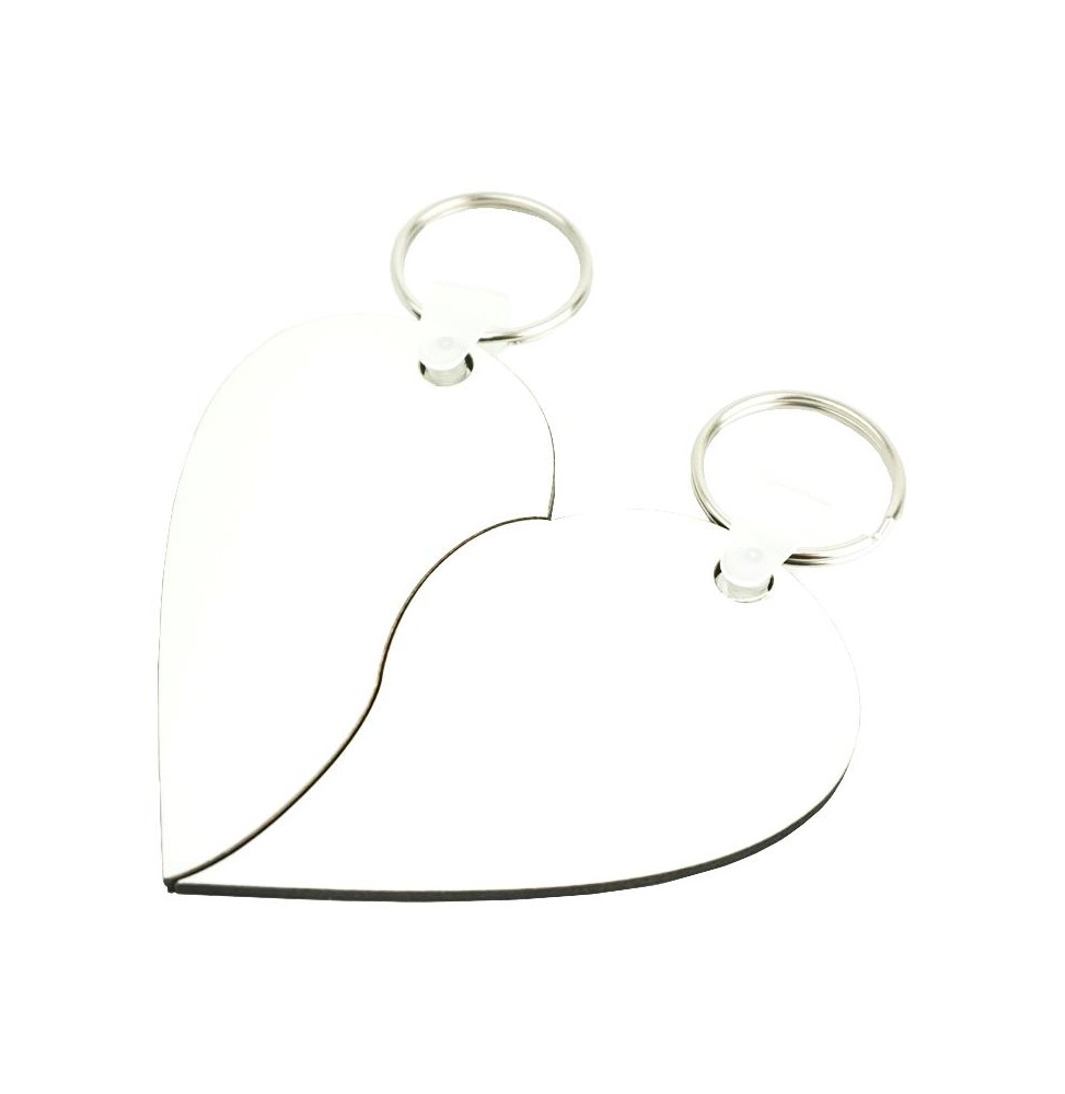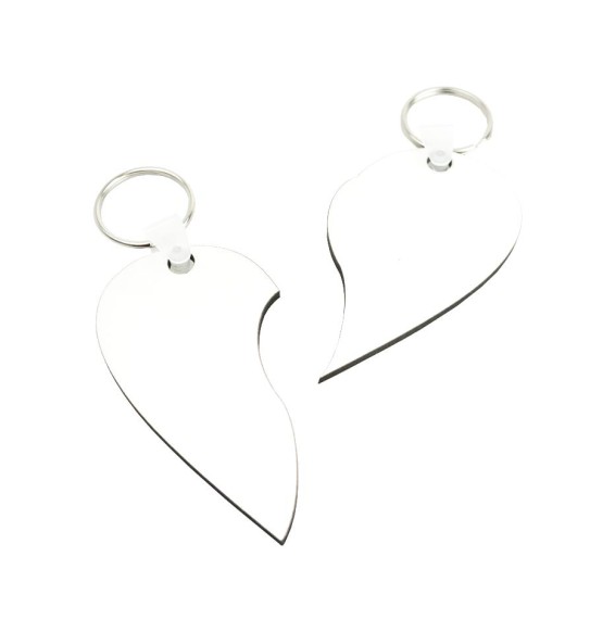 Llavero de madera con dos mitades en forma de corazón personalizable mediante sublimación. Ideal como regalo para parejas.
