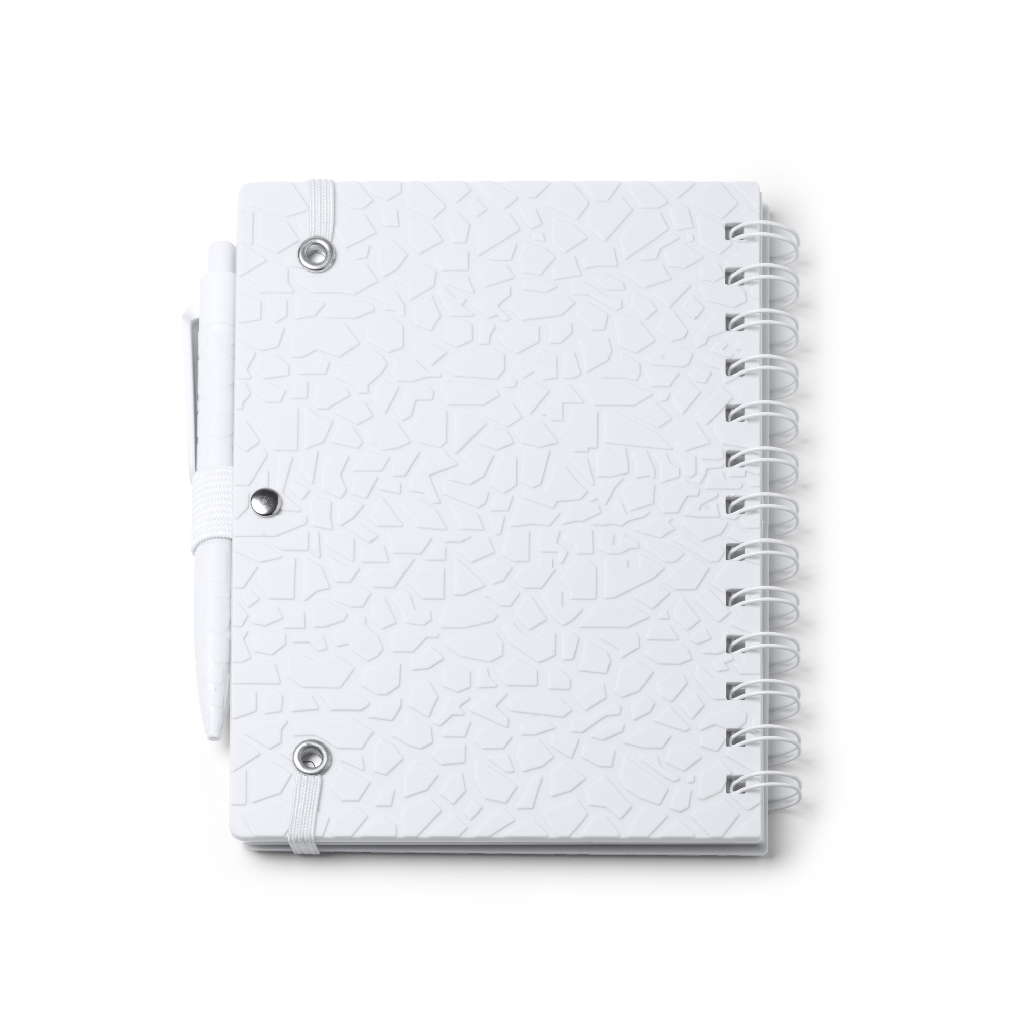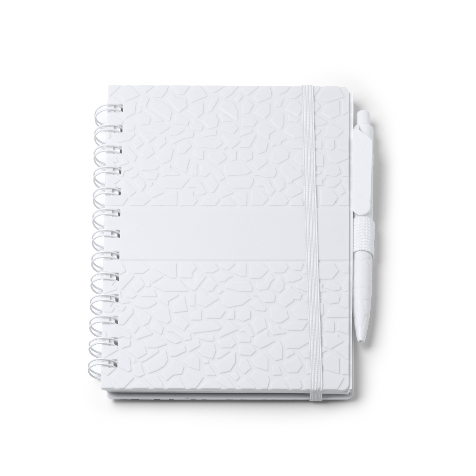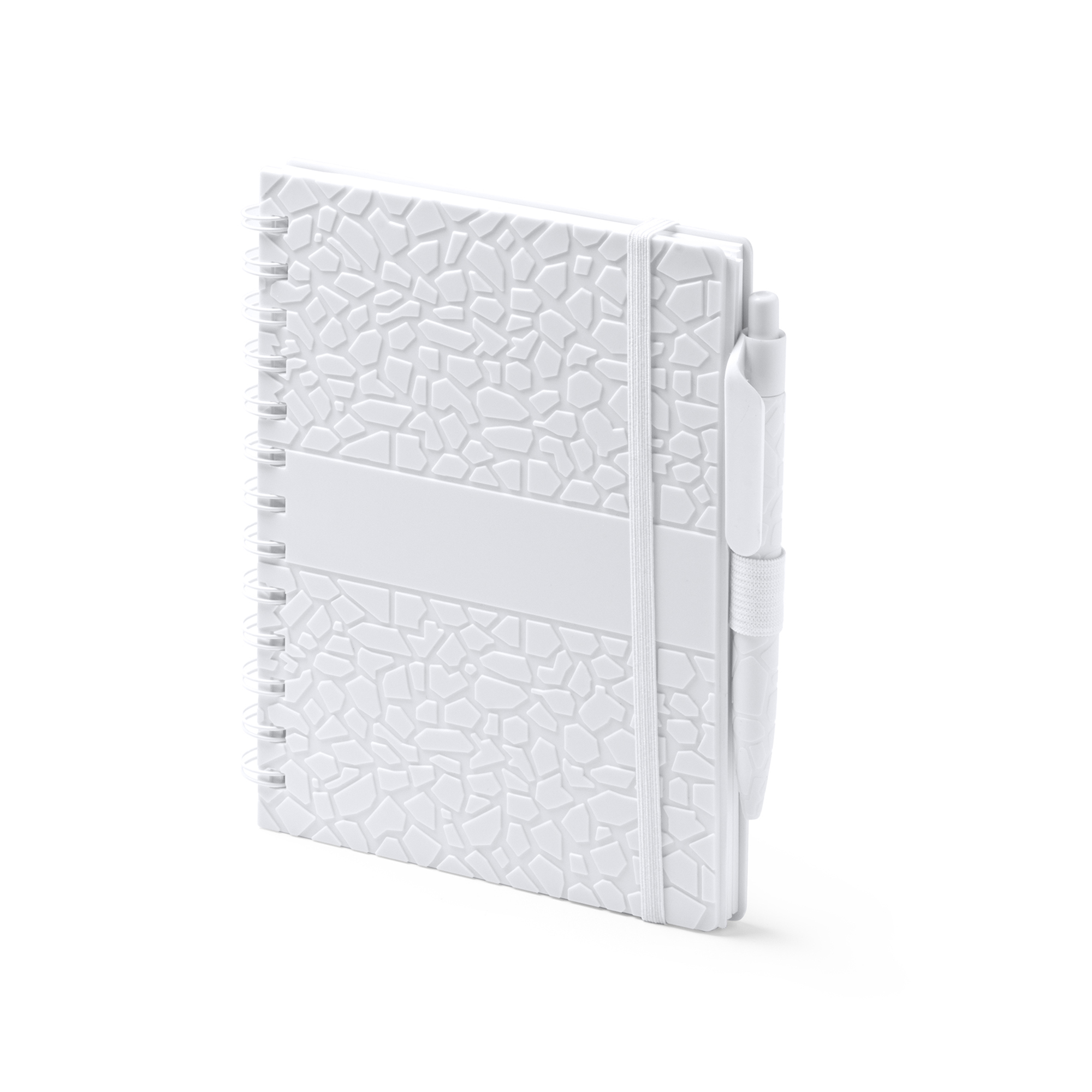 Libreta A5 realizada a base de estractos de piedra. Tapa rígida y doble anilla. Soporte con bolígrafo a juego. Tinta azul. 70 hojas a rayas.