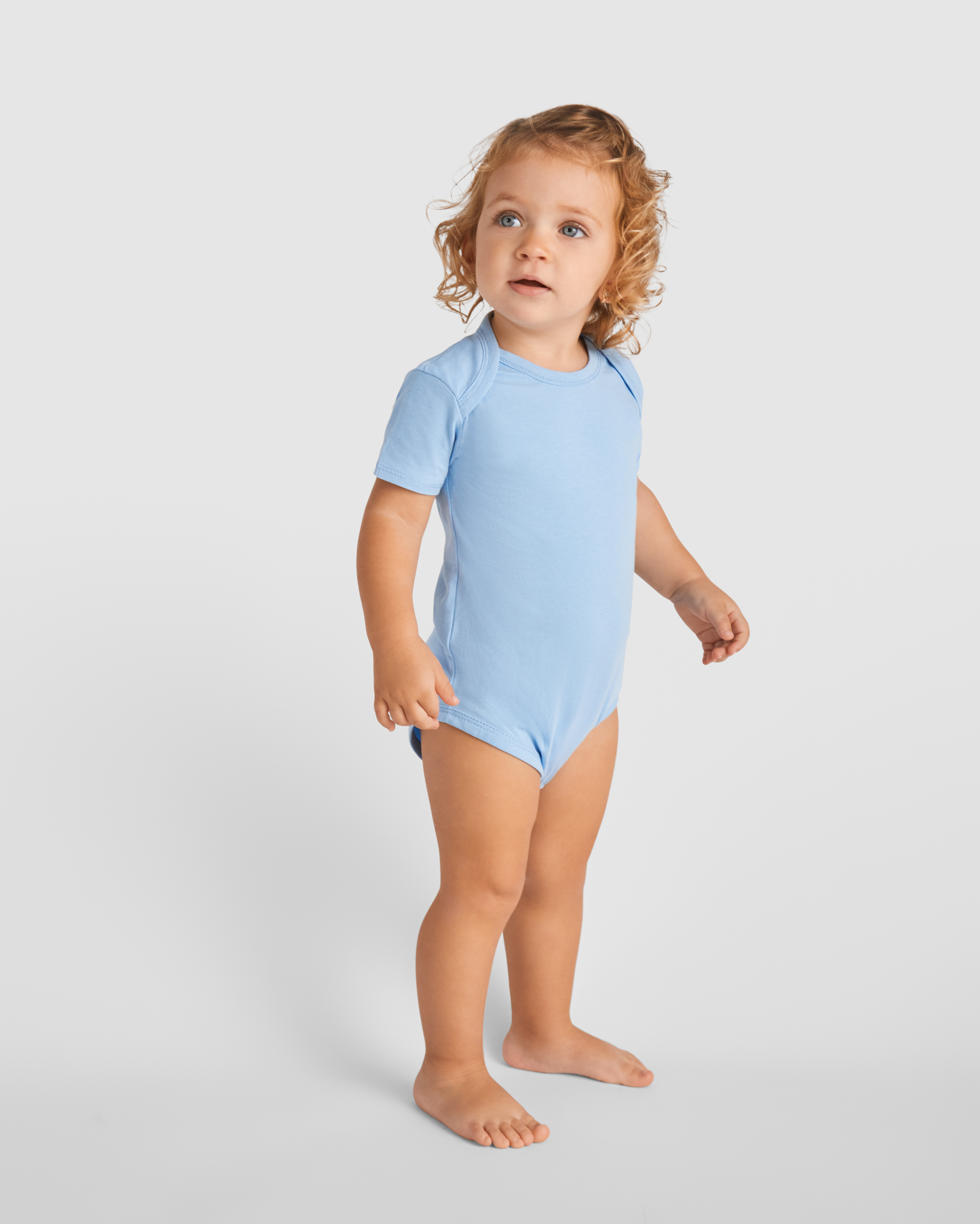 Body de bebé con manga corta de punto liso. Cuello redondo y bajo ribeteado en canalé 1×1. Cierre con botones a presión en la entrepierna. Hombro de apertura cruzada.