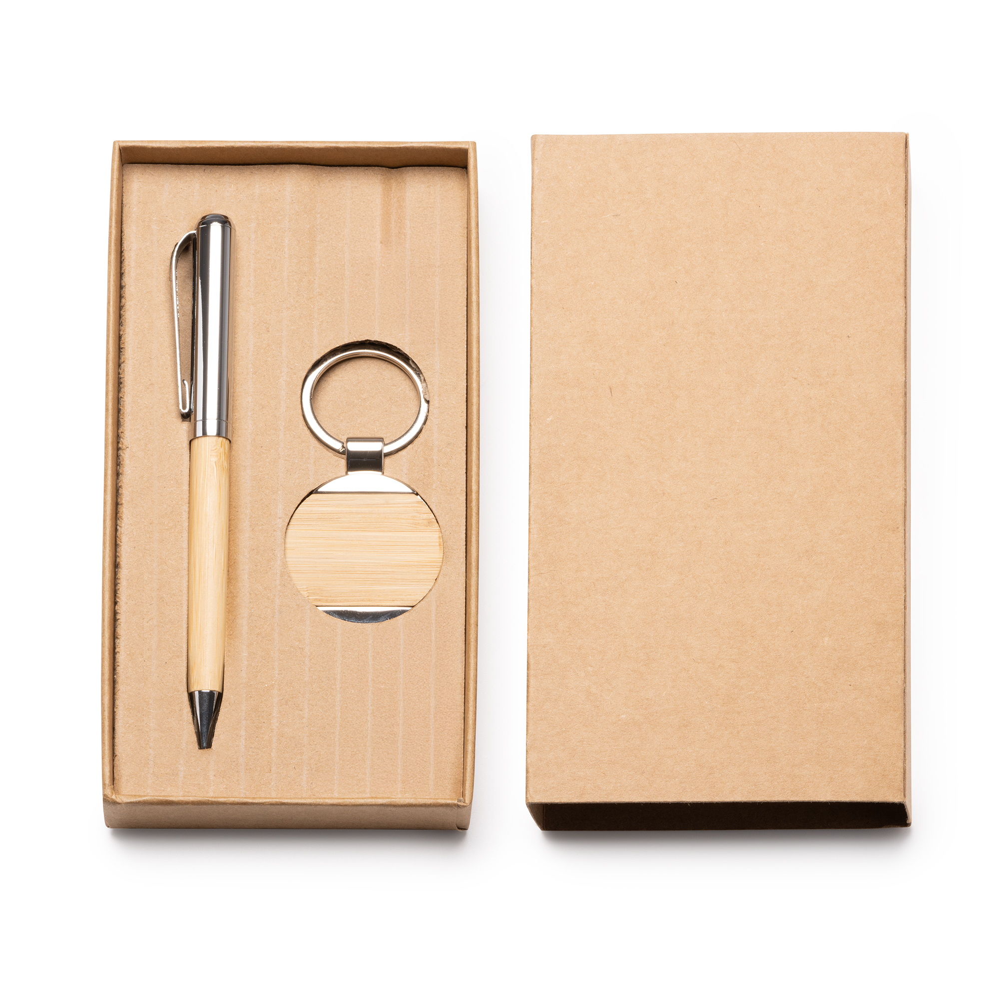 Set de bolígrafo y llavero de bambú con detalles metálicos. Tinta azul.